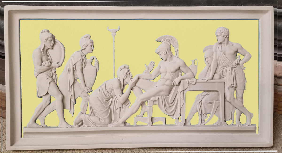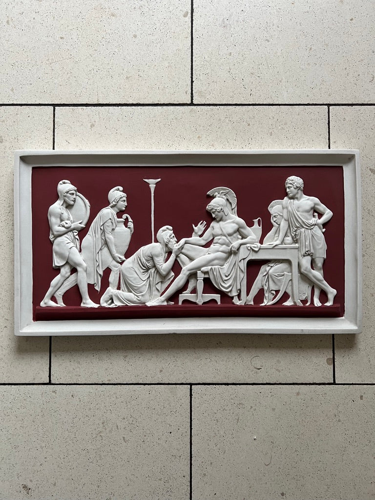 Eine klassische Wandtafel, die die berühmte Szene aus der griechischen Mythologie zeigt, in der Priamos den mächtigen Achilles um die Rückgabe von Hektors Leichnam anfleht.