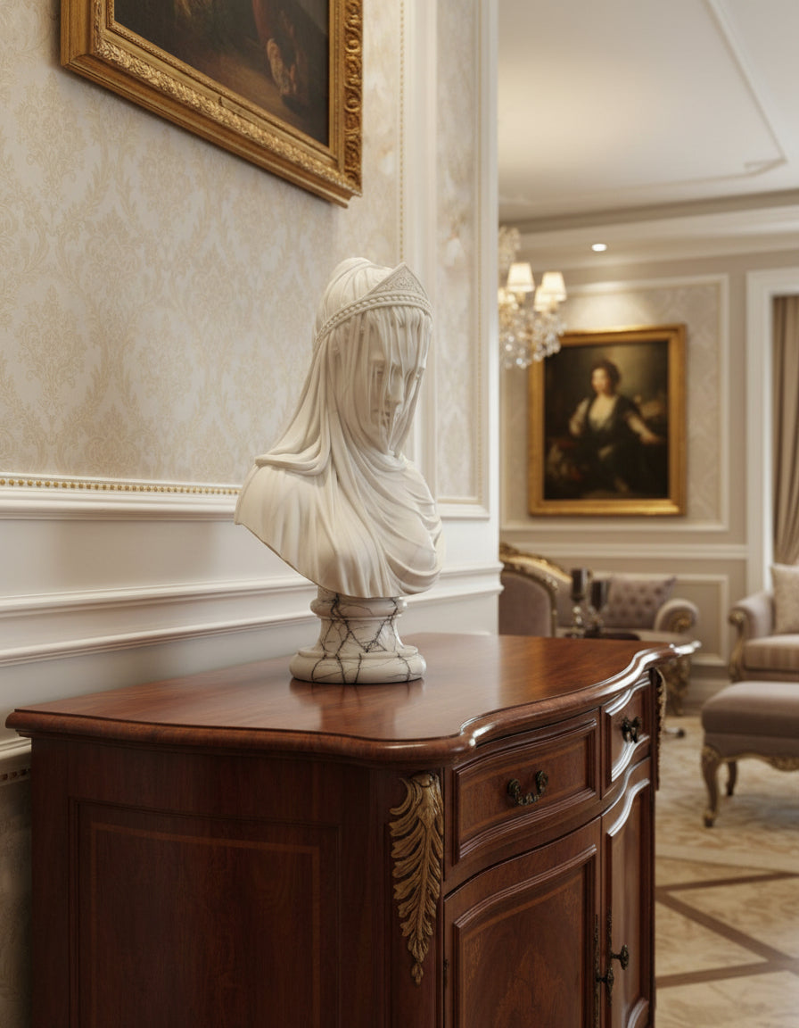 An ageless marble masterpiece, this marble sculpture shrouds the princess in a veil so diaphanous it defies the bounds of reality. Her eyes, as though sealed by aeons, bear witness to a sorrowful narrative etched within the stone. A tiara rests upon her marble brow, whispering of guardianship from realms beyond. Behold, the veil’s graceful cascade and the delicate replication of our sculptors artistry, now tailored to your abode by Sculptured arts arcane touch.