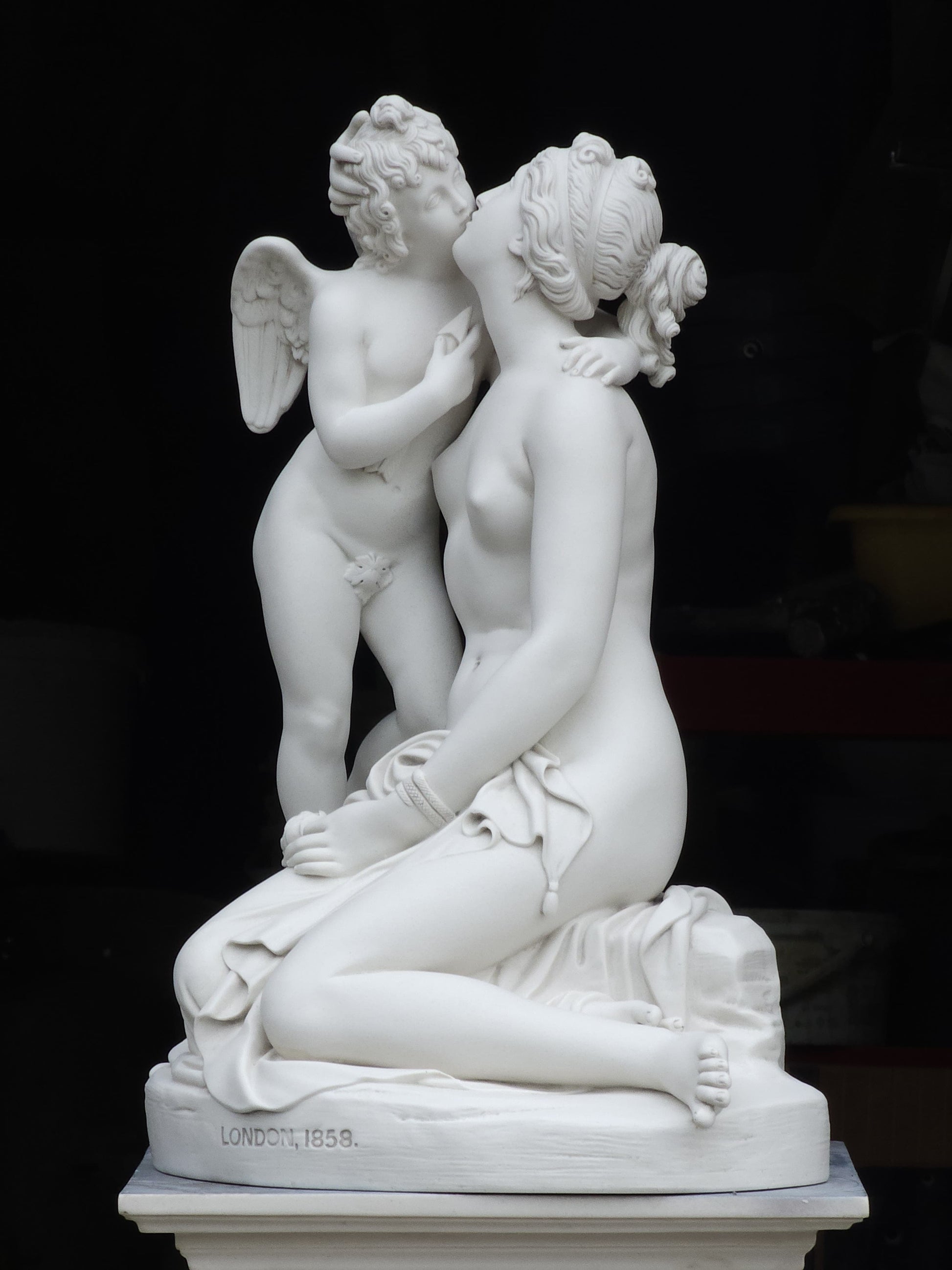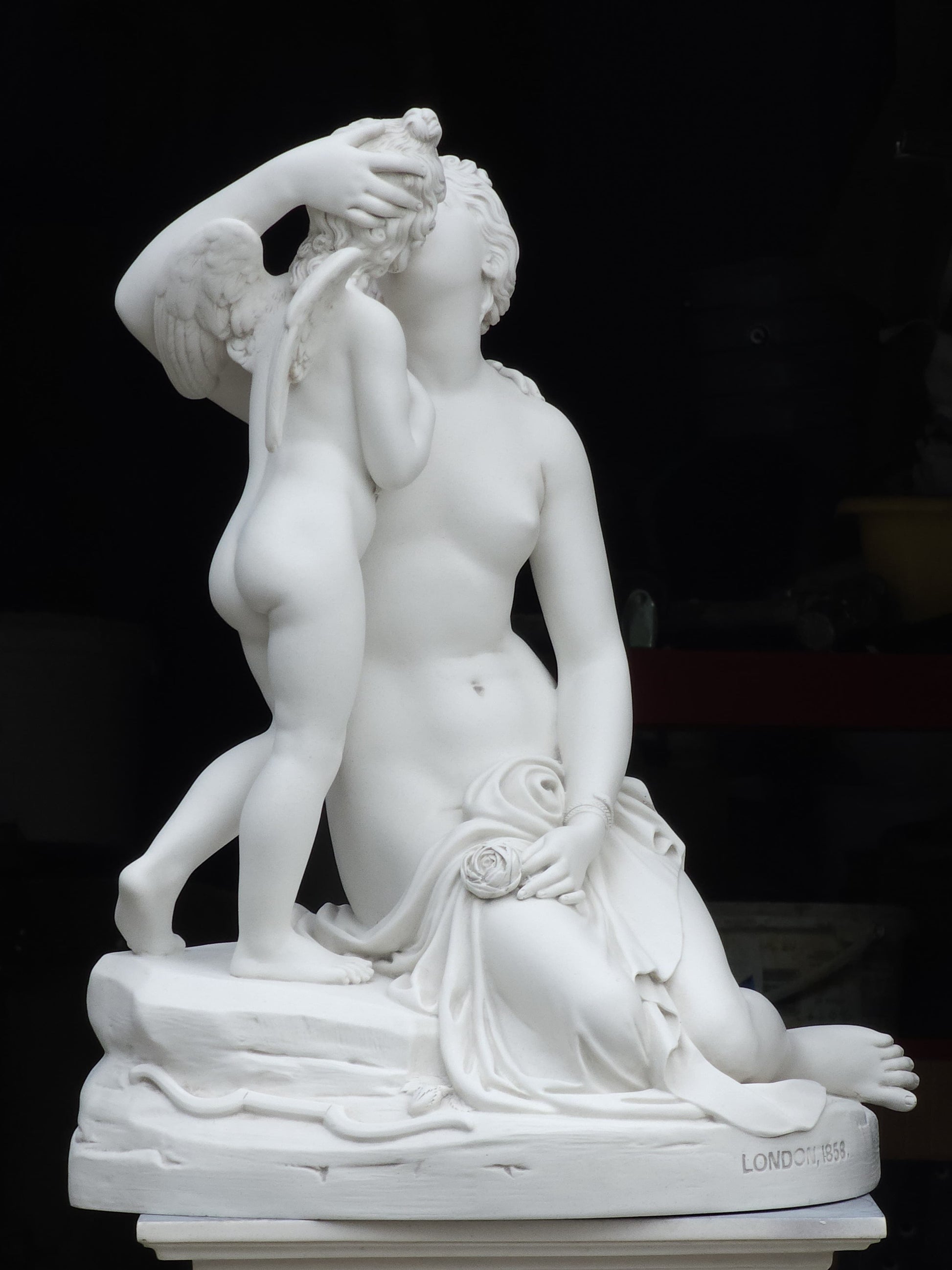 Venus is seated, scantily draped, a bracelet about one arm and a flower in her hand, Cupid, standing, embraces her, above an oval rocky-mound base, circa 1858.