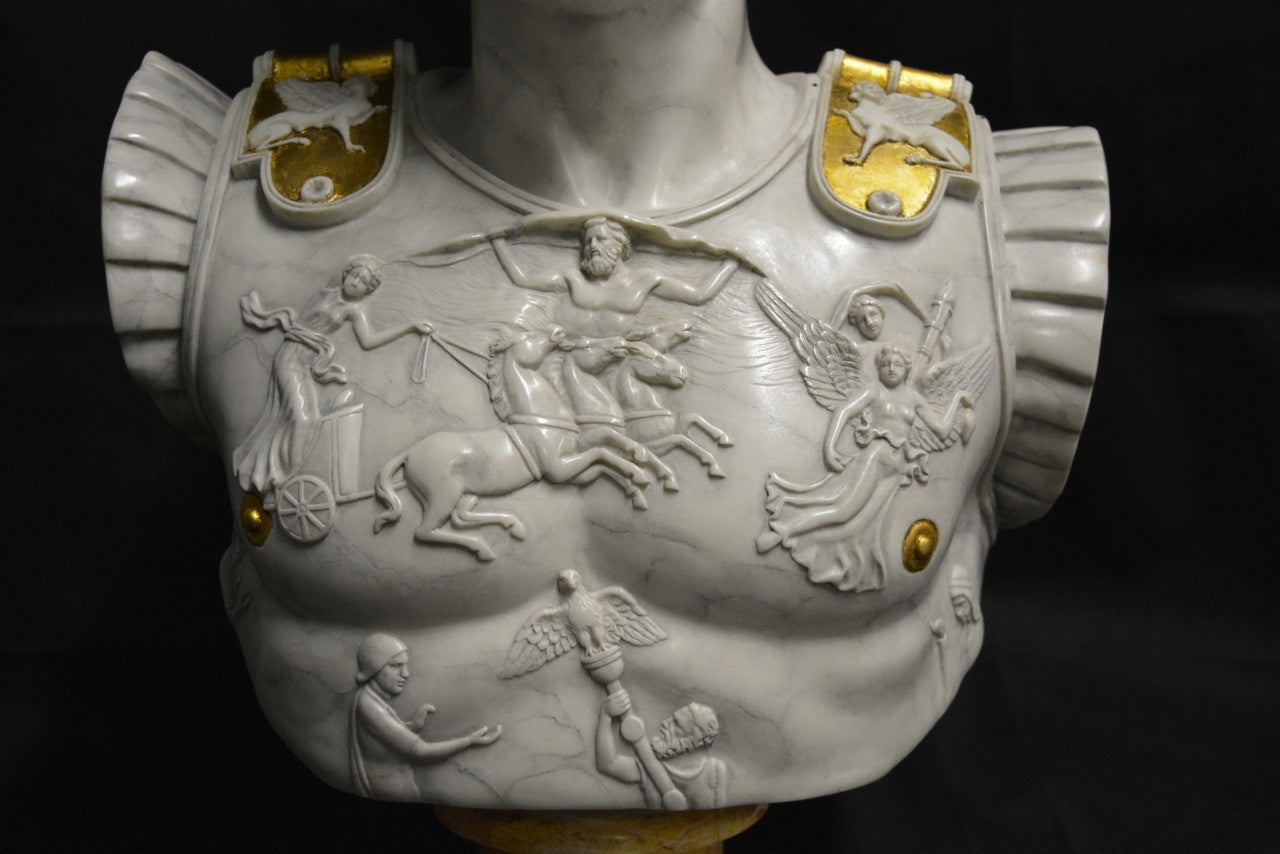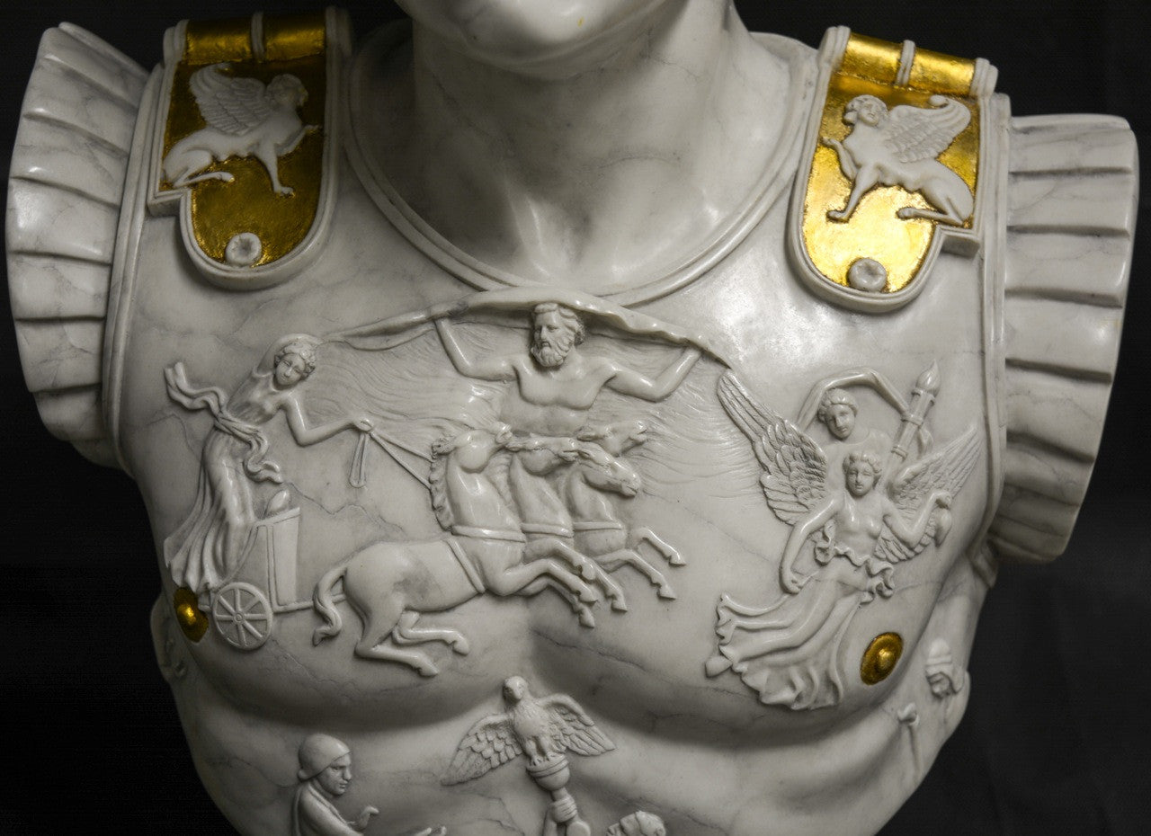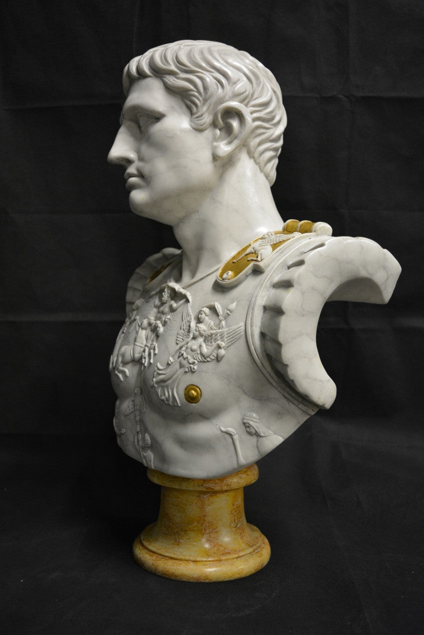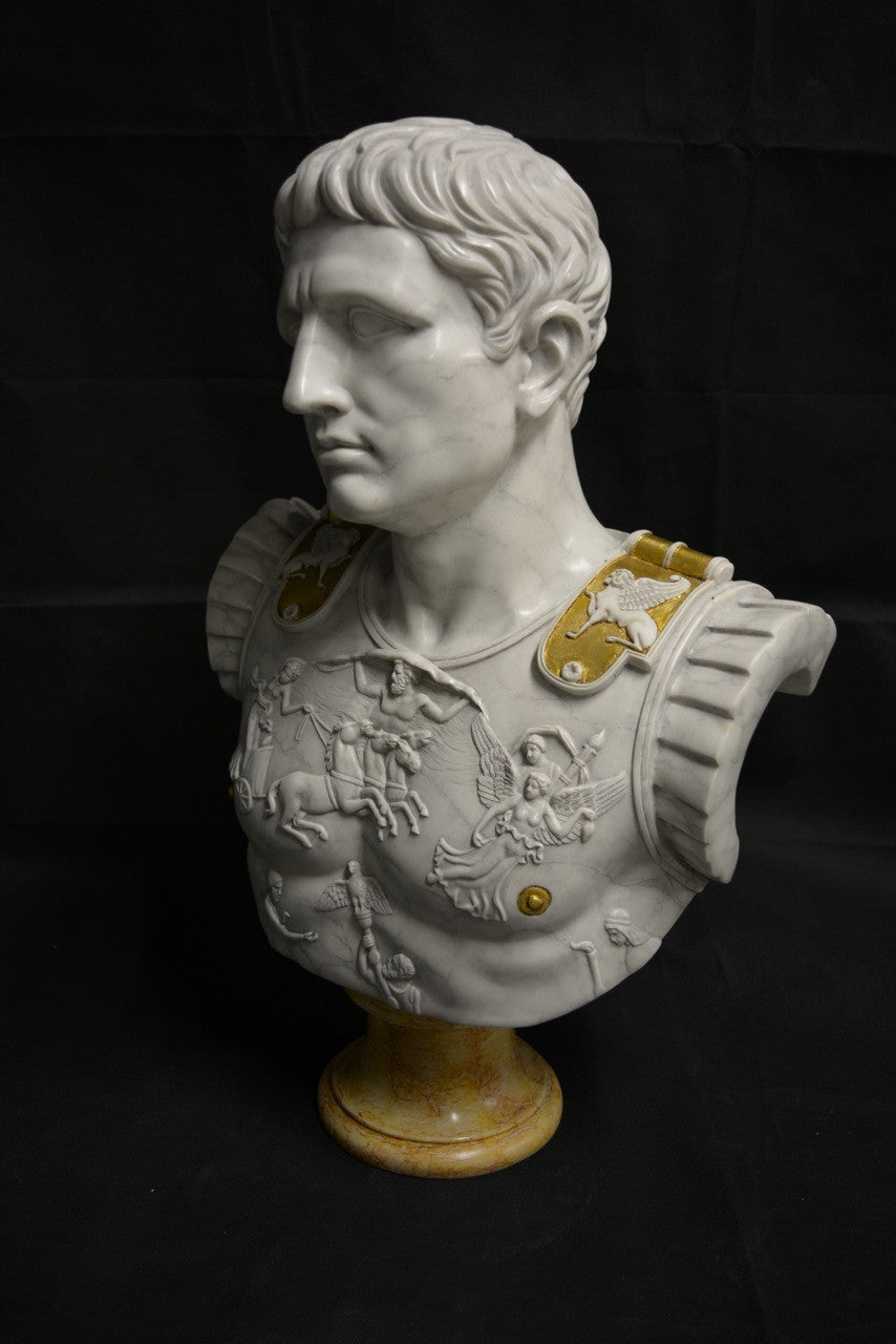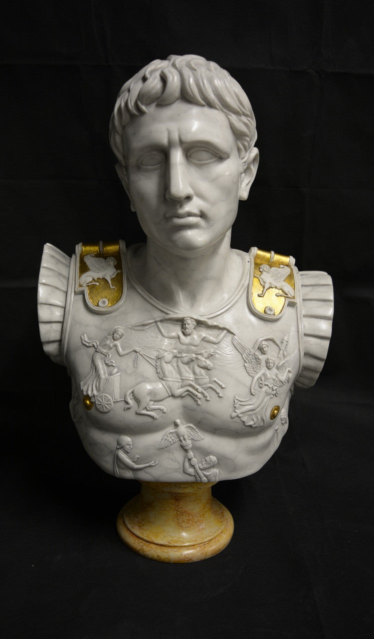 A highly detailed large Roman bust, depicting Emperor Augustus Caesar wearing his centurion breast plate armour.